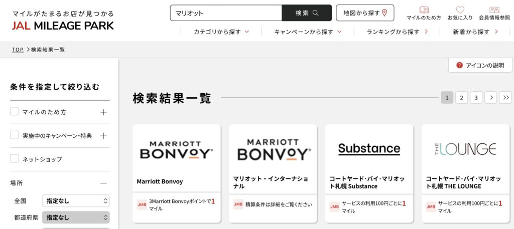 STEP1:JALマイレージパークの「マリオットホテル予約ページ」から検索